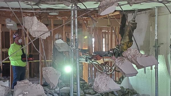 The best solution was our Husqvarna Robotic Demolition. This robot was able to punch holes in the block and work the ceiling down from outside the room without any risk for harm to the robot or personnel. It runs off 480 Volt , 3 phase power so fumes were not an issue. We were able to minimize cost, risk, and time impact with the use of this unique tool.